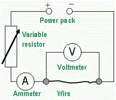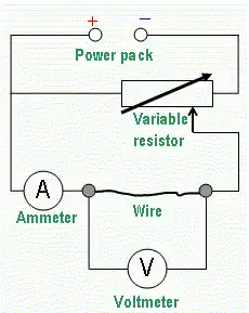 Set up either circuit and then by turning the voltage setting on the power pack and the slider on the rheostat, adjust the current to read 0.1 A. Take a reading of the voltage. Repeat for 0.2 A, 0.3 A up to 1.0 A. Repeat the readings but this time go from 1.0 A to 0.9 A and so on down to 0.1 A.