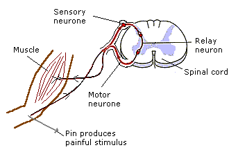In the pain reflex the stimulus is mechanical damage, the receptor is a "pain receptor", the pain receptor generates an electrical impulse in a sensory neurone which creates an electrical impulse in a relay neurone, which in turn creates an electrical impulse in a motor neurone. The impulse in the motor neurone stimulates a muscle, which is an effector, and this creates movement away from the painful stimulus as a response.