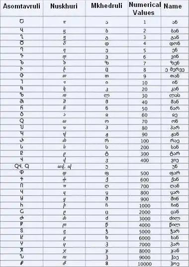This table only lists the modern (monocameral) mkhedruli alphabet (i.e. 33 letters that are also convertible to the other two alphabets, excluding the 7 additional mkhedruli letters that are now obsolete).