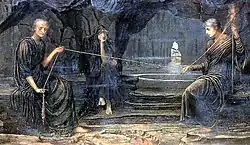 The Moirae, or Fates, are three old women who are charged with the destinies of all living beings, including heroes and heroines, and these destinies were represented by a string. They were called Clotho, Lachesis and Atropos.