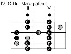 The 5 CAGED scales do not always provide a convenient transition between barre chords, arpeggios and improvisation. They also contain some difficult chord shapes. And if you seeIf you want to play quickly, the place where there are only two notes on one string disrupts the flow of the playing. A few hammerings or slides don't work at all because the corresponding notes are on different strings. You will learn that every fingering on every string (and consequently also on all CAGED scales) can be extended anywhere by two frets to the right or to the left. This of course changes the fingering and causes individual fingers to overextend, but some licks and riffs work better this way. We will derive other scale concepts from the CAGED scales in this way. This way you keep the orientation you acquired with CAGED, because you always know where the square or where the next semitone steps are.