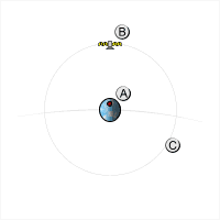 The satellite orbits at a distance of 36,000 km. It takes 24 hours to complete one orbit. Since the satellite and the Earth both complete one rotation in 24 hours, the satellite appears to "hang" in the sky over the same spot (A). In this orbit, the satellite stays over one area of the Earth's surface. Weather satellites use this type of orbit to observe changing weather conditions. Communications satellites, like satellite TV, also use this type of orbit.