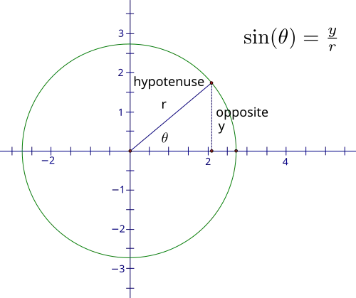 By now, you have become very familiar with the specific values of sine, cosine, and tangents for certain angles of rotation around the coordinate grid. In mathematics, we can often learn a lot by looking at how one quantity changes as we consistently vary another. In this case, what will happen to the value of, let's say, the sine of the angle as we gradually rotate around the coordinate grid. We would be looking at the sine value as a function of the angle of rotation around the coordinate grid. We refer to any such function as a circular function, because they can be defined using the unit circle. First of all, you may recall from earlier sections that the sine of an angle in standard position in the coordinate grid is the ratio of , where y is the y-coordinate of any point on the angle and r is the distance from the origin to that point.