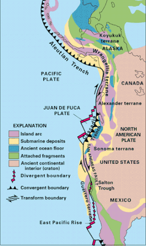 The map to the right (from the United States Geological Survey) shows some of the terranes on the western coast of North America, where they have been particularly well studied. The terannes are color-coded by type.