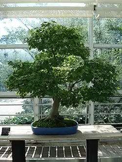 Japanese Maple has been grown in temperate areas around the world since the 19th century and has been cultivated in Japan for centuries.[3] In Japan it is used as an accent tree in Japanese gardens, providing gentle shade next to the house in the summer and beautiful colors in fall. Numerous cultivars are readily available commercially and are a popular item at garden centres and other retail stores in Europe and North America. Red-leafed cultivars are the most popular, followed by cascading green shrubs with deeply dissected leaves.[3] It is also a popular and appropriate choice for bonsai enthusiasts and has been used in this art throughout its history.