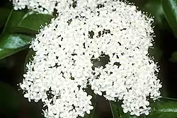 The flowers are creamy white, 9 mm diameter; the calyx is urn-shaped, five-toothed, persistent; the corolla is five-lobed, with rounded lobes, imbricate in bud; the five stamens alternate with the corolla lobes, the filaments slender, the anthers pale yellow, oblong, two-celled, the cells opening longitudinally; the ovary is inferior, one-celled, with a thick, pale green style and a flat stigma and a single ovule. The flowers are borne in flat-topped cymes 10 cm in diameter in mid to late spring. The fruit is a drupe 1 cm long, dark blue-black with glaucous bloom, hangs until winter, becomes edible after being frosted, then eaten by birds; the stone is flat and even, broadly oval. Wherever it lives, black haw prefers sunny woodland with well-drained soil and adequate water.[2][3][4][5]