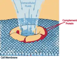 The complement system is a biochemical cascade of the immune system that helps clear pathogens from an organism, and promote healing. It is derived from many small plasma proteins that work together to form the primary end result of cytolysis by disrupting the target cell's plasma membrane.