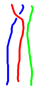 The three-string English sinnet is the most simple sinnet to create. You start by putting the three strings next to each other. Then you pick the left string and cross it over the middle string, making the left string the middle string and vice-versa. Then, you pick the right string, and cross it over the middle string, making the right string the middle string, and vice-versa. Repeat this process alternating the left and right string, until the desired length is reached.