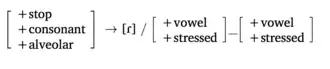 \phonb{\phonfeat{+stop \\ +consonant \\ +alveolar} }{[ɾ]}{\phonfeat{+vowel \\ +stressed} }{\phonfeat{+vowel \\ +stressed} }