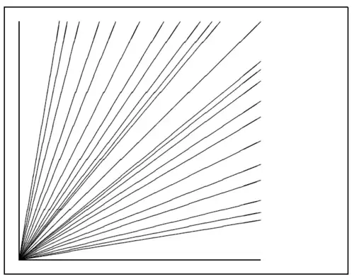 The components of the direction vector are restricted to the integers (−6, −5, ... , 5, 6) and they have to be coprime (no common divisor except 1). The figure below illustrates all 25 possible slope values in the first quadrant. The length is relative to \unitlength.