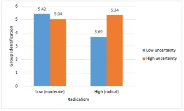 More recently, a study investigated the effect of uncertainty and group radicalism on group identification and intentions to engage in radical behaviors on behalf of the group.[8] The participants of the study were 26 male and 56 female students at the University of Queensland (17-46 years) with a median age of 19.7 years. The participants read information on an Australian government proposal (Higher Education Contribution Scheme - HECS) that students would have to pay their university fees up-front rather than after they left the university. HECS was highly controversial and opposed by the majority of university students. Next, they watched a short video interview with the leaders of a university action group that was formed. The interviewer asked questions that required interviewees to describe their group. There were both relatively radical and relatively moderate groups described. After the interview, participants were asked to complete a checklist on how extreme they felt the group was. Uncertainty was then manipulated via a two-stage procedure intended to maximize the strength of manipulation. In stage 1, several students were featured voicing uncertainty, or lack of uncertainty, about the consequences of HECS. In stage 2, participants were asked to write down three things about HECS that made them personally feel uncertain. After stage 2, participants completed a questionnaire that measured group identification. The study concluded that uncertainty significantly strengthens identification with the radical group and there was a tendency for uncertainty to weaken identification with the moderate group.[8]
