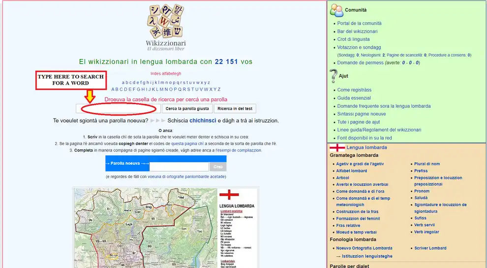 The image below shows the main page of the Lombard language Wiktionary. To search for a word, simply write the word in the search box and then click on "search for the right word" or "ENTER" on the computer keyboard.