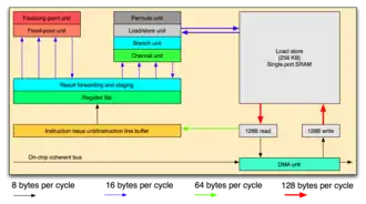 | Block diagrams of the IBM Cell processor. The Cell processor has 8 SPE cores (left) and 1 PPE core (right). The PPE core is the primary core, and controls the behavior of the SPE cores. | |