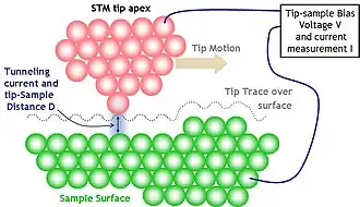 Scanning tunneling microscopy (STM) is based on the quantum tunneling effect, in which electrons can jump a short distance, even through a vacuum, between two conductive surfaces that are close enough to each other and above a certain voltage difference. In STM, a metallic probe sharpened to a single-atom point is brought to within a few nanometers from the surface that will be analyzed. This surface has to be conductive, so that a voltage differential between it and the probe can cause electrons to jump in between them, completing a circuit. There are two different modes for imaging: Constant height and constant current. In constant height, the probe is kept at a certain height, and changes in the current flow are measured as the probe scans horizontally. Constant current, on the other hand, moves the probe vertically while it is scanning so as to keep the current constant, and the vertical displacement is measured. Constant current is used mor often, as the surface does not have to be as flat as with constant height. The recorded data can then be used to make a map of the material's electron density, which correlates with its electrical properties and topography (heightmap).