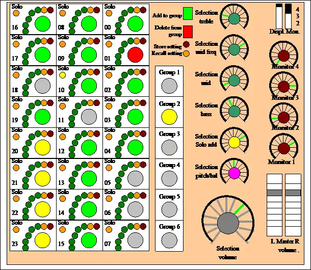 This example shows a possible mixing console with the possibilities in a certain situation: On the left side there are 24 (of possible 256) input selectors/displays. On each there is the input number and a “solo” button / lamp on which the channel (here 10) has more volume (Solo add). Then the level indicator chain of the input and – the most important thing- a selection button in several colours: If it is off, then the input is not connected in the physical ring. If it is green, the input is present and OK, but is not selected. If it is red, the input has encountered a problem – for example, a bad wire. If it is yellow, the input is selected. Pushing the input button selects this input, pushing a “Group” button selects the group – and all the inputs assigned to this group are yellow. In this example, group 2 was selected. The inputs 20, 21, 22 and 23 (for example 4 sopranos) are assigned to that group and are yellow. Now the selection buttons (selection volume, selection pitch/balance, selection bass / mid / treble, Monitor 1,2,3,4) will adjust the sound levels of the whole soprano group. If only one input is selected, the selection buttons adjust the sound of this input. The master volume left and right can be adjusted in every setting.