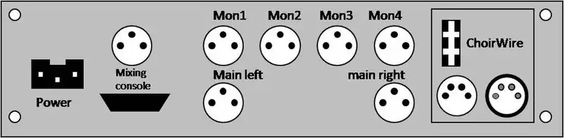 The data collector is the power supply for all distributed inputs and “collects” the music data from the right and left side of the physical data ring. It can be put in a 19’’ rack, for example, and mounted together with the power amplifier. It contains only connections: for power, for the remote mixing console (or laptop), then the sound outputs main and monitor channels and, of course, the connector for the ChoirWire distributed inputs. Of course, it is possible to build the mixing console and the data collector in one housing. (Then the main outputs are at the FOH – this is kind of taste.)