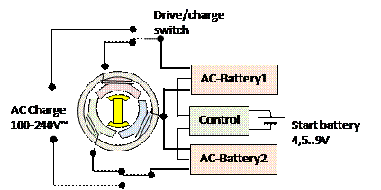 3-phase ESM motor drive and 1-phase / 3-phase AC direct grid charge with 6 AC-batteries in star connection. 0–1200 V DC solar charge with 6 AC-batteries in series connection. No charger, no inverter, no AC/DC converter. 6B-rectifier on star point is used to recharge 12 V.