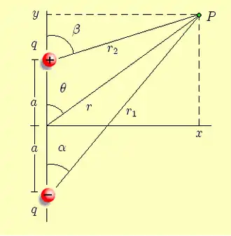 The quantity 2qa is defined as the dipole moment (p) and so we can substitute: