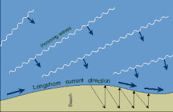 Ekman’s spiral is useful in understanding how ocean water can move vertically through the water column, especially within ocean water near coastlines along the continental margins. This upwelling and downwelling occurs when wind directions drive ocean currents either toward or away from the coastline. If the prevailing wind is blowing and results in surface ocean currents that move from the ocean toward the land and these surface ocean currents are perpendicular to the coastline, the surface ocean waters will result in a downwelling of ocean waters, as the ocean water is pushed deeper when it reaches the coast. However, when the prevailing wind is blowing from land out across the ocean and the surface ocean current is perpendicular to the coastline in the opposite direction, upwelling occurs, as the surface ocean water will be pushed away from coastline, bringing up deeper ocean water to the surface. Often however, the prevailing surface ocean currents are not simply perpendicular to the coastline, resulting in a flow of water called a Longshore Current. Longshore currents depend on a prevailing oblique wind direction that transports water and sediments, like beach sand along the coast parallel to the shoreline. When longshore currents converge in opposite directions, or there is a break in the waves, a Rip Current will form that moves surface ocean water away from the shore and out to sea. Rip currents are dangerous to swimmers, since the strong currents will carry unsuspecting swimmers away from the shore. It is important to note that the upwelling and downwelling of ocean water resulting from Ekman’s research is relatively shallow across the entire ocean, and occurs mostly along the shallow coastlines of islands and continents. The deepest ocean waters in the Abyssal Zone require a different mechanism to raise or lower these deep ocean waters to the surface, which will be discussed later. However, the discoveries and mathematical models of Ekman are important in understanding surface ocean circulation around the world.