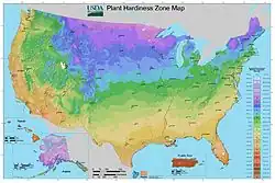 The 2012 USDA plant hardiness zone map used in the United States based on the average annual minimum winter temperature.