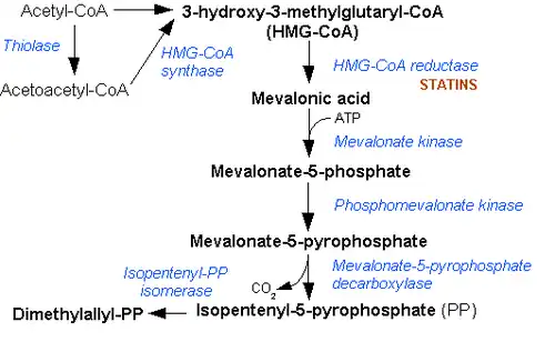 Simplified version of the steroid synthesis pathway with the terpenoid intermediates isopentenyl pyrophosphate (IPP), dimethylallyl pyrophosphate (DMAPP), geranyl pyrophosphate (GPP), and squalene shown. Some intermediates are omitted for clarity.