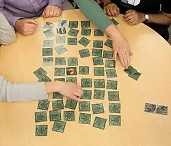 You know the game: cards are arranged face down, you turn over a card, then you try to remember where you have seen its match. It’s somewhere...thinks...yes, it was here! You turn it over to find … no match! It was somewhere else. You turn the cards over and your friend takes a turn. If you do turn over matching cards, you take the cards. Whoever has the more cards at the end wins.