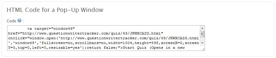 It's usually a good idea to use a pop-up window when linking to a quiz, as it will create maximum space, and removes the URL bar and the navigation buttons which can interfere with the quiz's own navigation. Question Writer Tracker generates HTML code to create a pop-up window for your quiz.