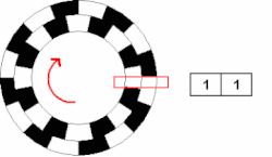 Gray code is a specific type of binary pattern in which there is only a single bit changing during a transition from one element to the next. Being a binary pattern, Gray codes use the same number of channels for the same number of specific patterns; they are just ordered differently. Binary uses patterns in a numerically sequential order; Gray code does not. Encoding positions using this method will require additional software or hardware to decode the ID (as a simple binary conversion will not yield a sequentially-ordered set of segments), but the benefits for the reliability of hardware are substantial – as only a single bit changes during each transition, then the maximum error in detected position for an error in pattern reception is 1 segment. Gray code can be written out bitwise in much the same way binary can. In binary, the least significant bit alternates from 0 to 1 every step; the next bit alternates every two steps, the next every four and so on. In Gray code, each bit holds a pattern of 0-1-1-0; the least bit holds each element for one step; the next bit holds each two steps, the next four and so on. It can be noticed that two-channel Gray code is identical to the two-channel pattern used to find rotational direction.