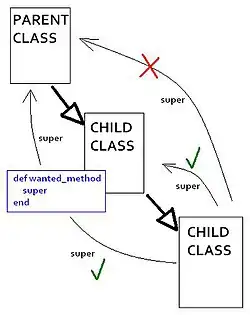 If you have a deep inheritance line, and still want to access some parent class (superclass) methods directly, you can't. super only gets you a direct parent's method. But there is a workaround! When inheriting from a class, you can alias parent class method to a different name. Then you can access methods by alias.