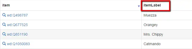 #defaultView:ImageGridWhat looks like a comment, is actually an instruction to display the query result as images instead of a table.?x1This means that we query for any predicate, not only for “is an instance of”. Think of predicates like “depicts” (P180) or “is named after” (P138). We are not using ?x1 anywhere else in the query, meaning the placeholder stands for “I don’t care what the predicate is, give me all results that somehow have a cat as the subject”OPTIONALInside the curly braces you see another statement that adds optional data to the result. The placeholder ?item is reused and coupled with the predicate P18 (meaning “(has) image” and a new placeholder ?pic. Wrapping the statement with OPTIONAL means that items do not necessarily have to have a P18 predicate to show up in the list and that the ?pic placeholder can be empty.