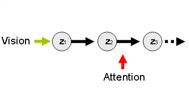 We've got three brain regions represented by grey circles. Each region has a certain level of output, denoted , and . Between the three regions are fixed connections shown by black arrows, in this example going in just one direction. Coming into our system, via Region 1, we have some kind of visual information as an external input. Additionally, the connection between Region 2 and Region 3 is modulated by attention. This means that attention only has an effect if this connection is in use.