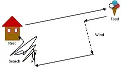 A simple experiment to demonstrate that ants completely rely on path integration was shown by Collett and Collett. Returning ants were displaced into either familiar or unknown areas before they reach their goal. In both cases the ants continue their route until they reach the point where they should have reached the nest. Only then do they start to show search behaviour [6].