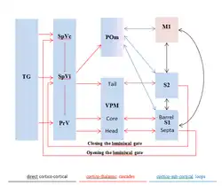 The sensory neurons make excitatory glutamatergic synapses in the trigeminal nuclei of the brain stem. Trigemino-thalamic neurons in the principal trigeminal nucleus are organized into somatotopically arranged ‘‘barrelettes,’’ each receiving strong input from a single whisker as shown in (Figure 3). The principal trigeminal neurons project to the ventral posterior medial (VPM) nucleus of the thalamus, which is also somatotopically laid out into anatomical units termed ‘‘barreloids’’ VPM neurons respond rapidly and precisely to whisker deflection, with one ‘‘principal’’ whisker evoking stronger responses than all others. The axons of VPM neurons within individual barreloids project to the primary somatosensory neocortex forming discrete clusters in layer 4, which form the basis of the ‘‘barrel’’ map as shown in Figure 3.