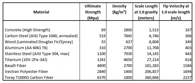 A taller constant width column or longer constant width cable will exceed the strength of the material and therefore collapse or break. Structural limits can be reached from other causes than gravity, such as centrifugal acceleration. We therefore call the general case Scale Length because it is not always due to height. As examples, common steel has a strength of 275 MPa and a density of 7800 kg/m^3, and Earth surface gravity is 9.81 m/s^2, so the scale length is 3600 meters. A very strong carbon fiber/epoxy composite column has a strength of 1300 MPa and a density of 1650 kg/m^3 and so a scale length of 80 km. Since the Earth's radius and equivalent gravity well depth is 6378 km, the gravity well to scale length ratio for this material is 80:1.