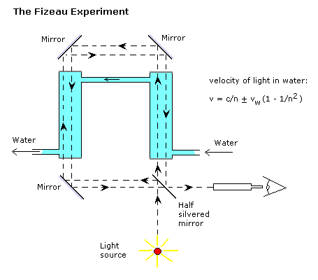 The Fresnel drag coefficient was confirmed by an interferometer experiment performed by Fizeau. Water was passed at high speed along two glass tubes that formed the optical paths of the interferometer and it was found that the fringe shifts were as predicted by the drag coefficient.