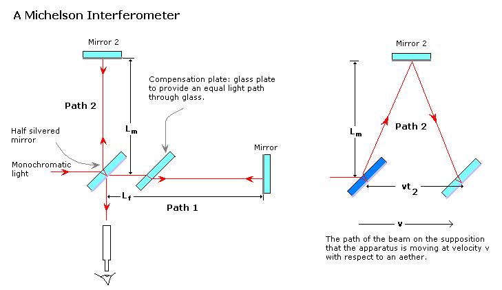 However, no fringe shift is observed. The null result of the Michelson-Morley experiment is nowdays explained in terms of the constancy of the speed of light. The assumption that the light would have a velocity of and depending on the direction relative to the hypothetical "aether wind" is false, the light always travels at between two points in a vacuum and the speed of light is not affected by any "aether wind". This is because, in {special relativity} the Lorentz transforms induce a {length contraction}. Doing over the above calculations we obtain: