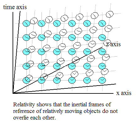 Einstein's analysis shows that the x-axis and time axis of two observers in relative motion do not overlie each other, The equation relating one observer's time to the other observer's time shows that this relationship changes with distance along the x-axis ie: