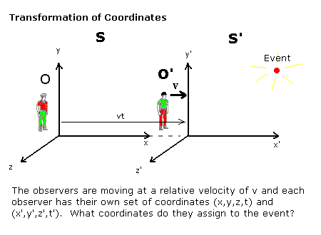 Suppose there is a small event, such as a light being turned on, that is at coordinates in one reference frame. What coordinates would another observer, in another reference frame moving relative to the first at velocity along the axis assign to the event? This problem is illustrated below: