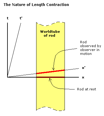 The way that measuring rods differ between observers can be seen by using a Minkowski diagram. The area of a Minkowski diagram that corresponds to all of the events that compose an object over a period of time is known as the worldtube of the object. It can be seen in the image below that length contraction is the result of individual observers having different sections of an object's worldtube in their present instant.