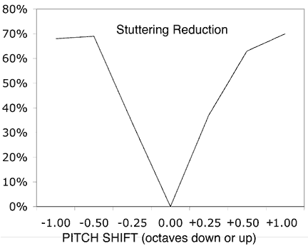 A quarter-octave pitch shift reduces stuttering about 35%. A half-octave pitch shift reduces stuttering about 65-70%. A full-octave pitch shift reduces stuttering about 70-75%.