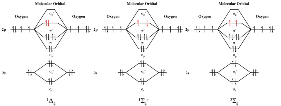 Singlet oxygen comes from the electronic excitation of triple oxygen, the energy is experimentally 0.98 electron volts per mole of electrons. The figure below illustrates the different states of oxygen. 1Δg and 1Σg+ represents singlet oxygen as it has a spin state equal to one, the triplet degenerate state is represented by 3Σg-, the transition is represented by 1Δg←3Σg-