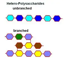 There are two types of polysaccharides: homo-polysaccharides and hetero-polysaccharides. A homo-polysaccharide is defined to have only one type of monosaccharide repeating in the chain; whereas, a hetero-polysaccharide is composed of two or more types of monosaccharides. In both types of polysaccharide, the monosaccharide can link in a linear fashion or they can branch out into complex formations. It should also be noted that for a polysaccharide to be considered acidic it must contain one or more of the following groups: phosphate, sulfuric, or carboxyl.