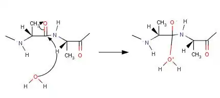 In a normal peptide hydrolysis reaction without the help of a catalyst, water acts as a nucleophile to attack the electrophilic carbonyl carbon. The carbon atom being attacked goes from its initial sp2 state (trigonal planar) to a new sp3 state (tetrahedral) in its transition state.