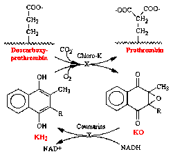 Prothrombin synthesized in the absence of vitamin K or in the presence of vitamin K antagonists such as dicourmaorl gives rise to an anticoagulant factor as opposed to the regular thrombin that is a coagulant factor. An anticoagulant factor prevents the blood from clotting and is used to treat patients with thrombosis.