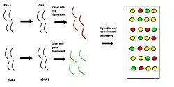 An example of how one can use microarray testing in order to analyze RNA is in the case of cancerous skin cells. A microarray test can be done to see what genes in the cancerous skin cells are similar to healthy skin cells and which ones are different. This is done by taking a sample of mRNA from healthy skin cells and a sample of mRNA from cancerous skin cells. Both of the mRNA of these skin cells are converted into cDNA. The healthy cDNA can then be labeled with a green fluorescent marker. The cancerous cDNA can then be labeled with a red fluorescent marker. Then a microarray containing all of the DNA in a skin cell is made. The fluorescent cDNAs are then both put onto the microarray. The specific cDNA sequences then hybridize to the corresponding DNA on the microarray. The excess cDNA is then washed off. Then a laser is used to analyze where the fluorescent cDNA hybridized. A computer takes this information and analyzes it giving several dots of color on a sheet indicating which genes are expressed by the healthy skin cell (which would show up as a green dot) and which are expressed by the cancerous skin cell (which would show up as a red dot). The yellow dots would indicate that the healthy and cancerous skin cell both express that certain gene. A black dot indicates that neither the healthy cell nor the cancerous skin cell expressed that gene. Thus by analyzing this data, one can find out what genes are expressed in cancerous skin cells that are not expressed in healthy ones.