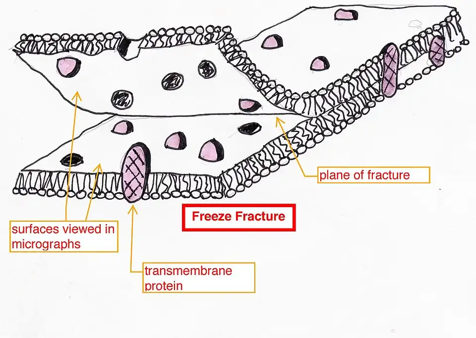 Freeze Fracture (along with metal shadowing and imaging via electron microscopy) is a technique that can be used to visualize membrane structure and protein distribution. First, a cell is rapidly frozen in liquid nitrogen. Then it is cleaved along the fracture plane that splits the lipid bilayer. Separation along this plane exposes the proteins embedded in the membrane. After fracture, the two sections are coated/shadowed with a heavy metal like platinum. Acid is used next to dissolve the organic material, resulting in a replica of the surfaces of the sample. The replicas are then viewed with an electron microscope. The micrographs show bumps on the surface of the sample, which actually are transmembrane proteins since the surfaces of the sample's halves correspond to the inner faces of the phospholipid bilayer. This confirmed that membrane proteins are randomly dispersed throughout the phospholipid bilayer, and that there are integral transmembrane proteins that span the entire membrane.