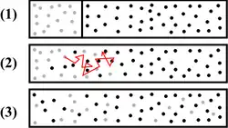 Passive Transport Molecules have a natural tendency to move and spread out evenly in any available space. This property is called diffusion. An example would be a drop of dye in a section of a beaker separated by a permeable membrane. In this case, the dye, although the molecules move randomly, would have a net movement across the membrane such that the concentration of dye on both sides would be equal. At that point, an equilibrium would be established with the same amount of dye molecules moving across the membrane in both directions. In other words, the natural tendency of any substance is to migrate down its concentration gradient.