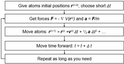 Simulations are conducted in a series of "time steps." In each step, the force on each atom is calculated according to the derivative of the energy equation. The atom is moved a certain distance corresponding to the magnitude and direction of the force over the size of the time step. The process is repeated over many time steps, iteratively calculating forces and solving the equations of motion based on the accelerations from the forces, and produces results that mimic complex behavior from docking of pharmaceutical compounds to the folding of simple proteins.