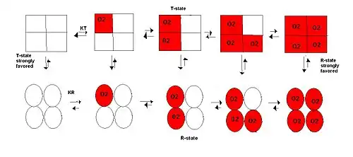 The concerted model (symmetry model or MWC model): enzyme subunits are connected in such a way that a conformational change in one subunit is necessarily conferred to all other subunits. Thus all subunits must exist in the same conformation. Example: In hemoglobin, the tetramer changes conformation together (R state) after four oxygen molecules bind to all four monomers. The transition from the T state to the R state occurs in one step.