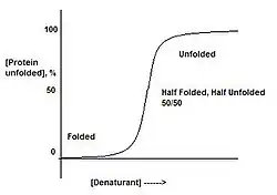 For instance, if a protein is put in a denaturant where only one part of the protein is unstable, the entire protein will unfold. This is due to the domino effect where destabilizing one part of the protein will in turn destabilize the remainder of the structure. When a protein is in conditions which correspond to the middle of the transition between folded and unfolded, there is a 50/50 mixture of folded and unfolded protein, instead of 'half-folded' protein.